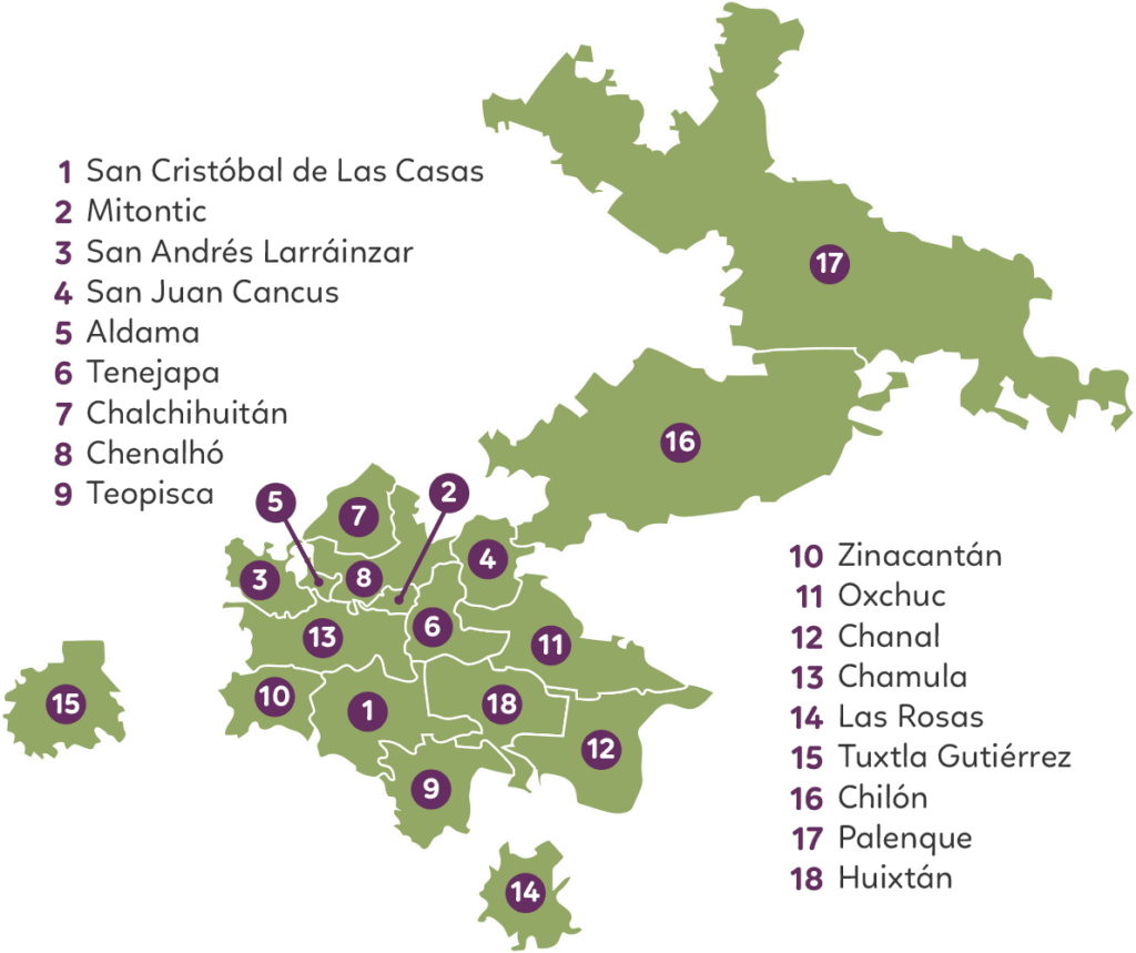 Municipios de incidencia: San Cristóbal de Las Casas, Mitontic, Aldama, San Andrés Larráinzar, Tenejapa y San Juan Cancúc.